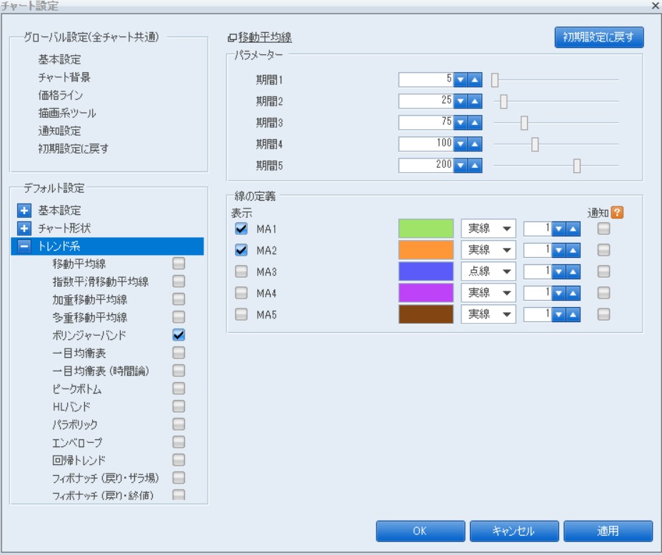 楽天FXのマーケットスピードでは、チャート設定→トレンド系→ボリンジャーバンドで選択できます。